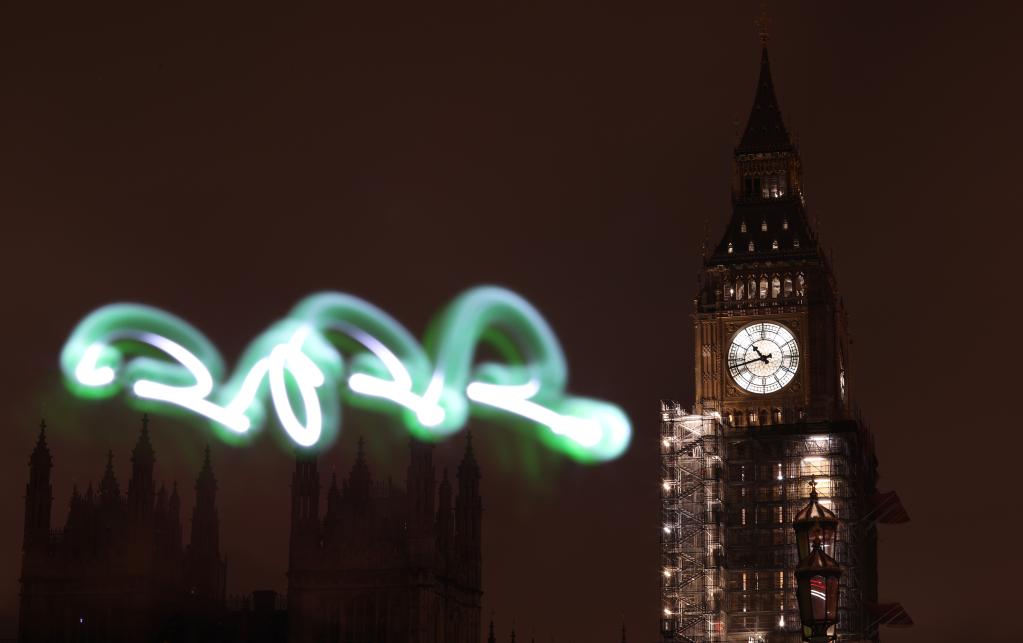 這是2021年12月31日在英國倫敦拍攝的大本鐘和光繪“2022”。(新華社記者李穎攝)