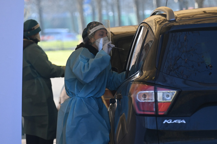 2021年12月31日,醫務人員在意大利博洛尼亞一處“不下車”新冠病毒快速檢測點工作。新華社發(賈尼·斯基基攝)