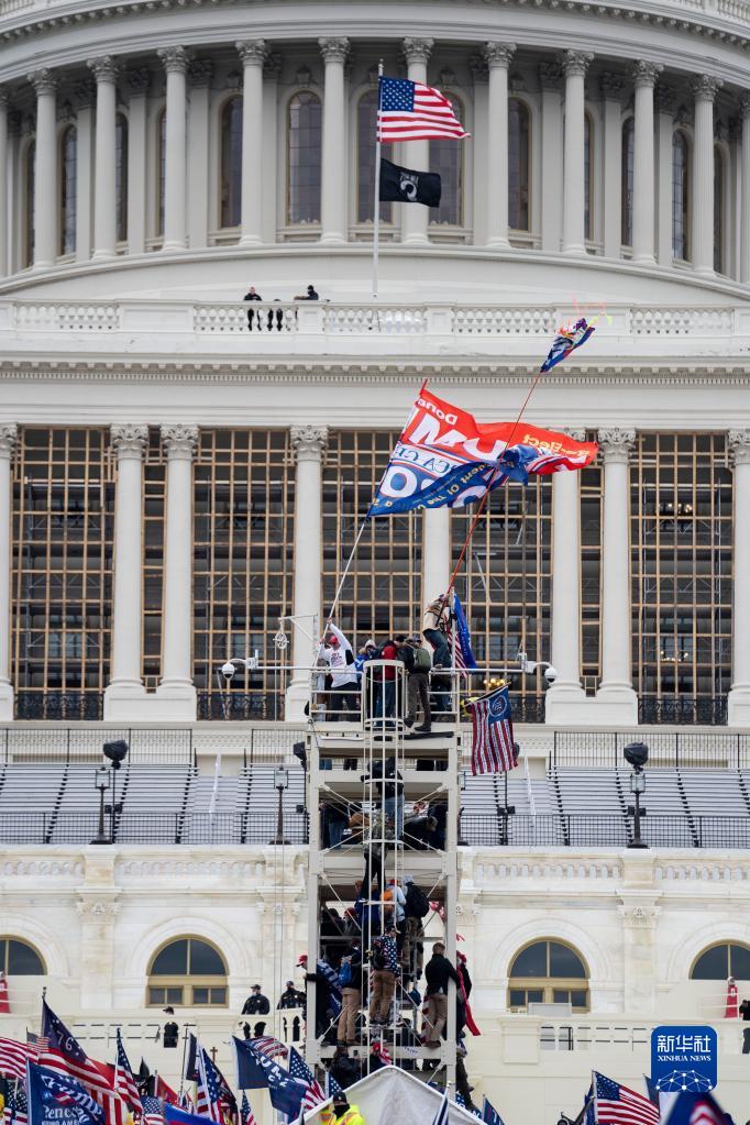 2021年1月6日,特朗普支持者在美國首都華盛頓的國會大廈前舉行示威時占據(jù)下屆總統(tǒng)就職典禮的媒體拍攝高臺。當日,大批支持時任美國總統(tǒng)特朗普的示威者強行闖入美國國會大廈,與警方發(fā)生沖突,造成5人死亡多人受傷。