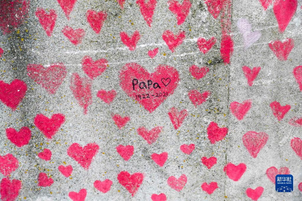 這是2021年8月9日拍攝的英國倫敦國家新冠紀念墻上的紅心和留言。為了紀念在新冠疫情中去世的人們,英國在倫敦議會大廈對面的泰晤士河沿岸設立了國家新冠紀念墻。逝者的親友和志愿者在幾百米長的紀念墻上畫上紅色的心,每一顆心代表一名因新冠去世的英國人,表達對逝者的哀思。