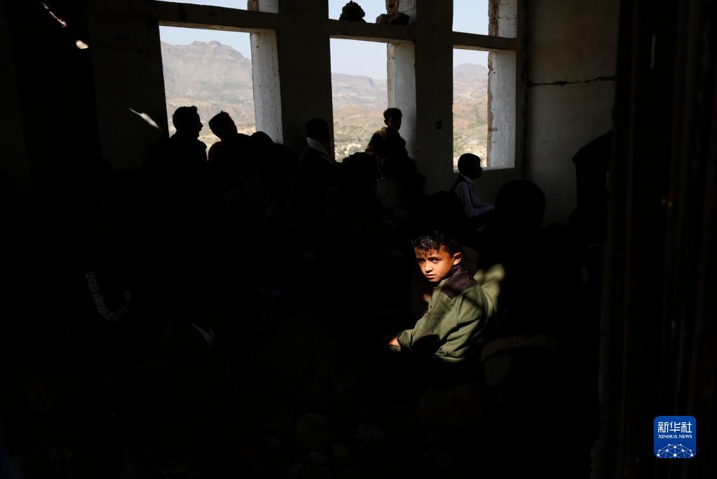 2021年8月14日,一名男孩坐在也門伊卜省被戰火損毀的一棟教學樓內。