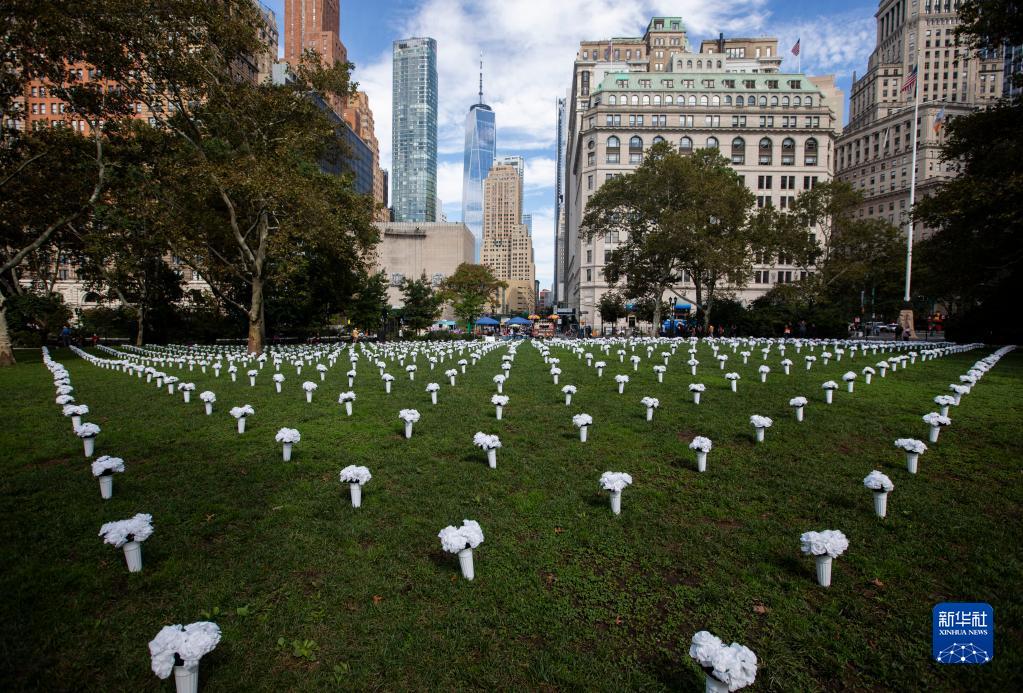 2021年10月8日,悼念槍支暴力遇難者的白色瓶花擺放在美國紐約炮臺公園的草坪上。現(xiàn)場的1050個白色瓶花旨在悼念2020年在紐約州死于槍支暴力的1050名受害者。