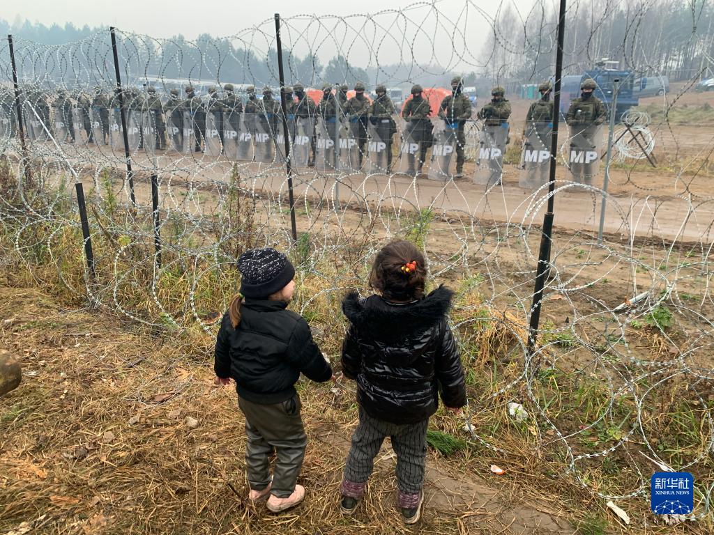 2021年11月14日,在白俄羅斯靠近波蘭邊境的一處難民點,兩名兒童透過邊境線上的鐵絲網(wǎng)遙望波蘭一側的軍人。