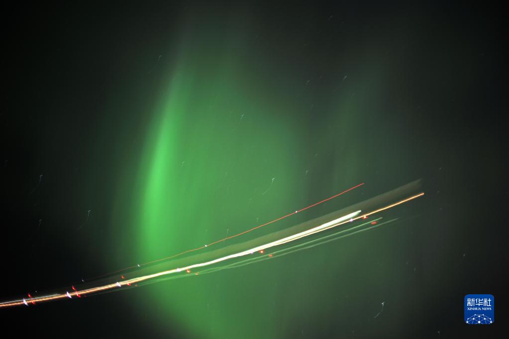 2021年3月20日凌晨,在美國阿拉斯加州安克雷奇,飛機飛過出現極光的天空(長時間曝光照片)。