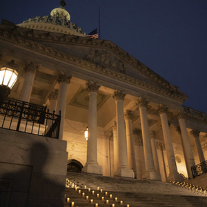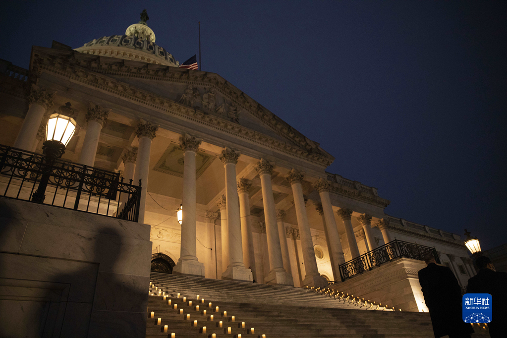 1月6日,美國首都華盛頓國會大廈降半旗、擺放蠟燭,紀(jì)念國會山騷亂事件一周年。