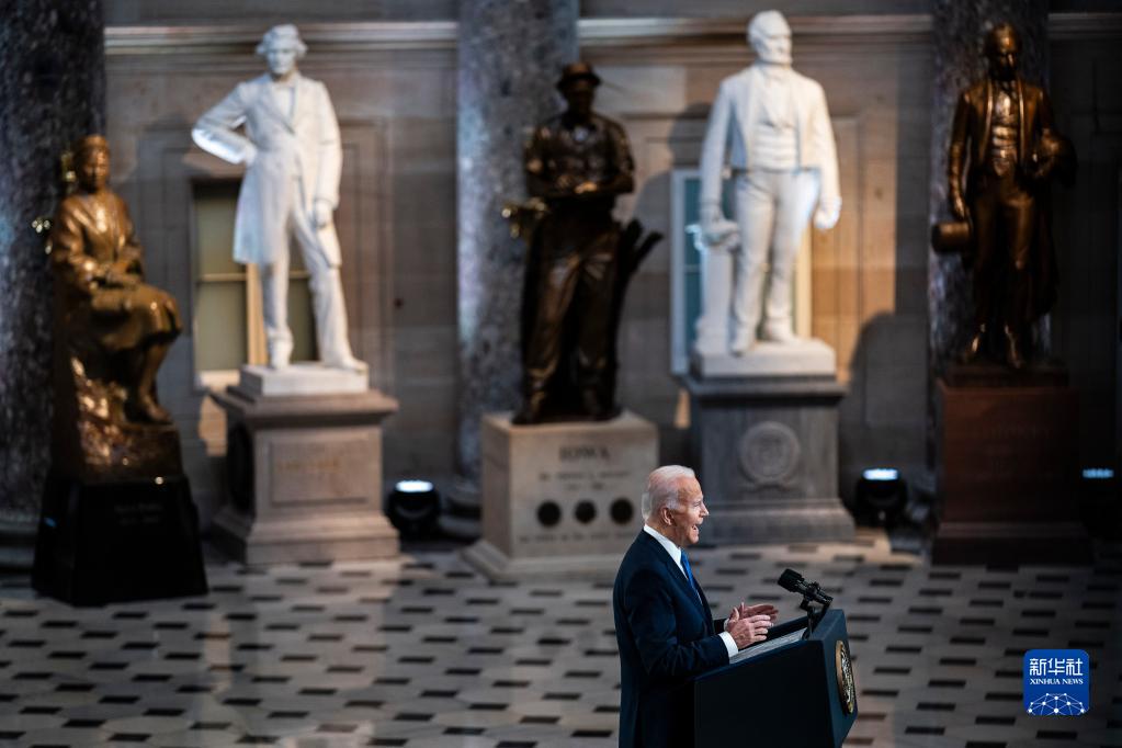 1月6日,美國總統(tǒng)拜登在華盛頓國會大廈發(fā)表講話,紀念國會山騷亂事件一周年。