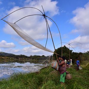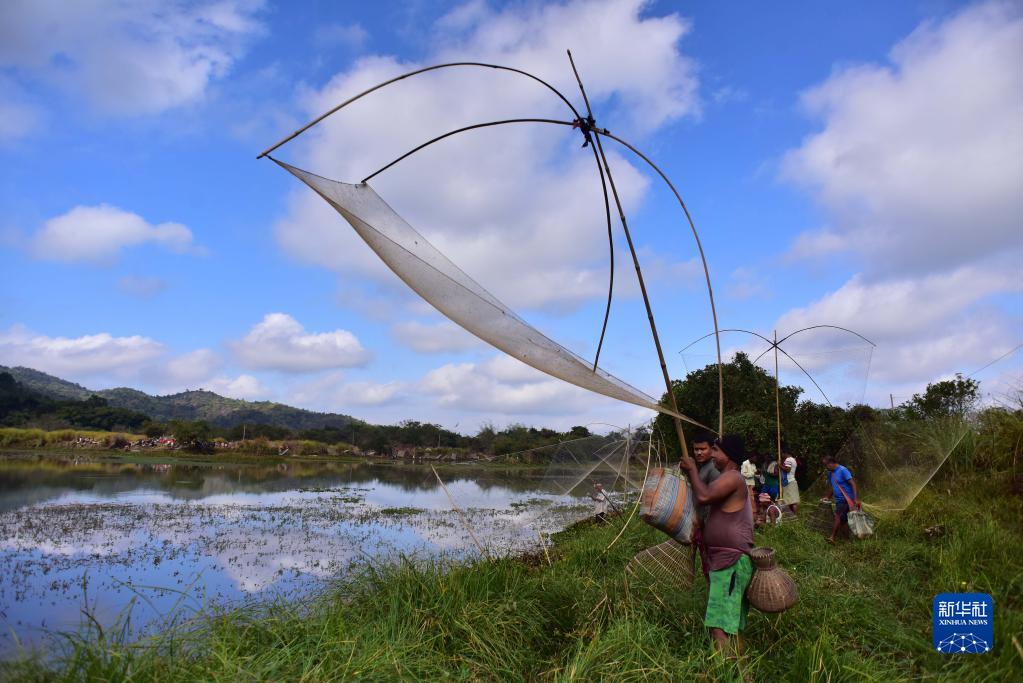 1月13日,在印度阿薩姆邦高哈蒂一處村莊,當地村民參加捕魚活動,慶祝收獲季的結束。新華社發