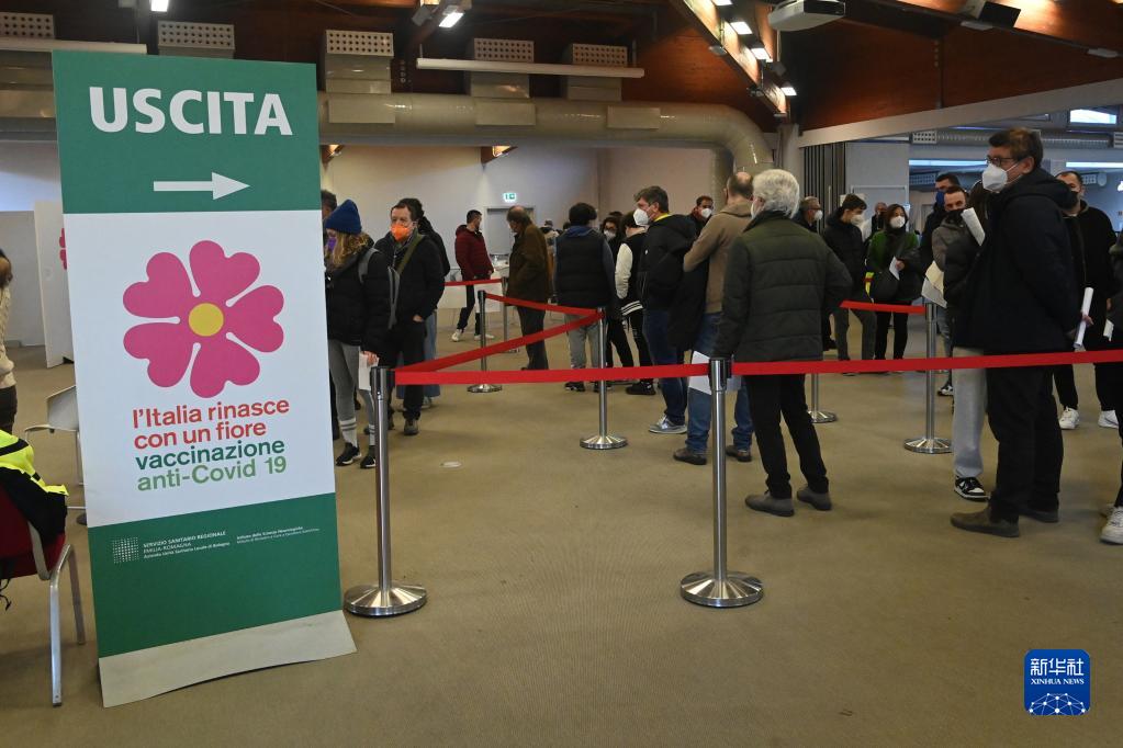 1月16日,人們在意大利博洛尼亞一處新冠疫苗接種中心排隊等待接種新冠疫苗。