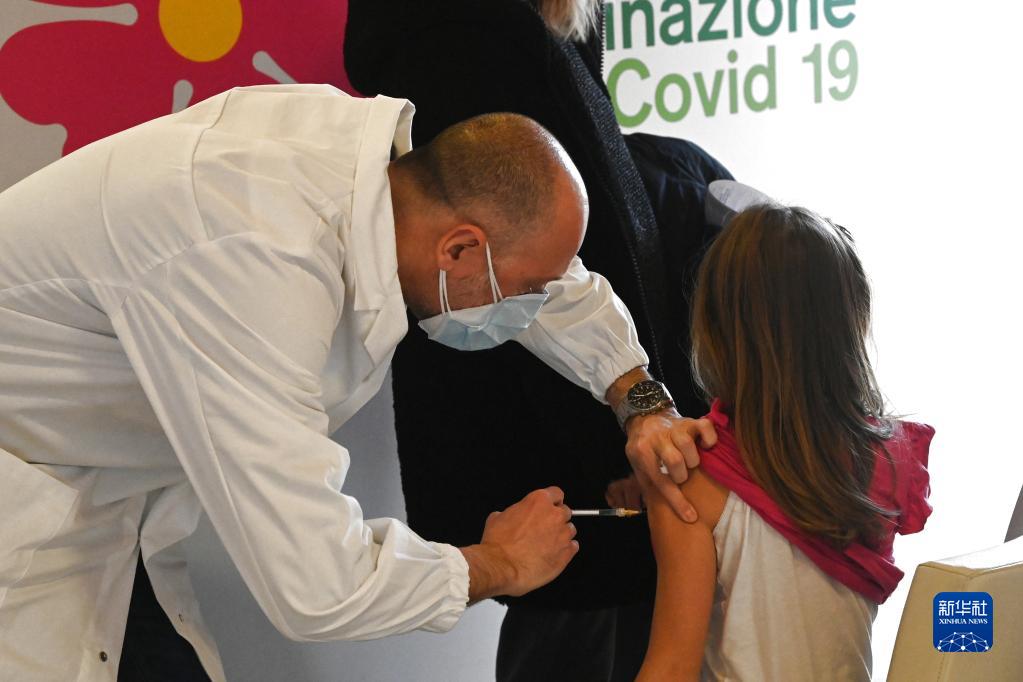 1月16日,一名兒童在意大利博洛尼亞一處新冠疫苗接種中心接種新冠疫苗。