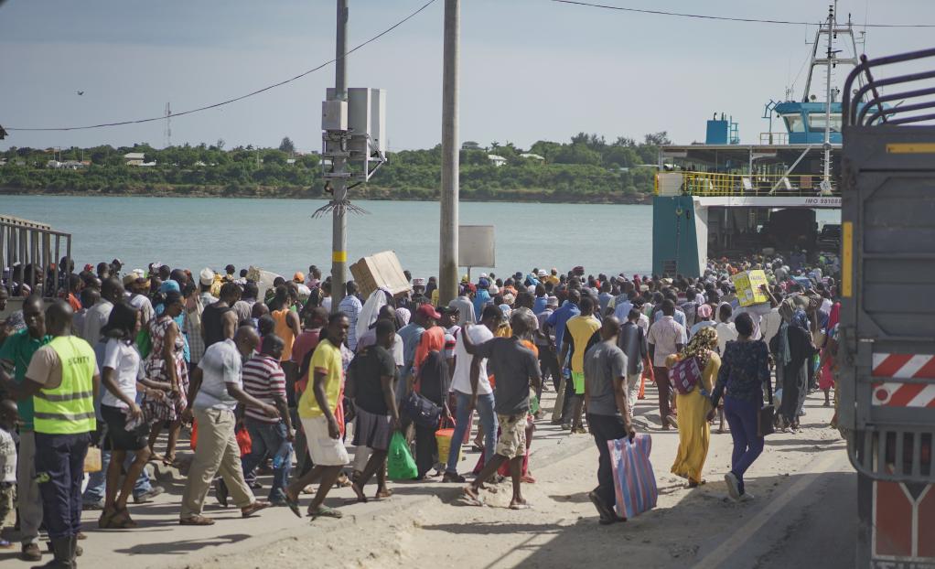 2020年1月25日,在肯尼亞蒙巴薩,在海上浮橋建成前,當?shù)鼐用裰荒艹俗喍赏得砂退_島和利科尼鎮(zhèn)。新華社記者李琰攝