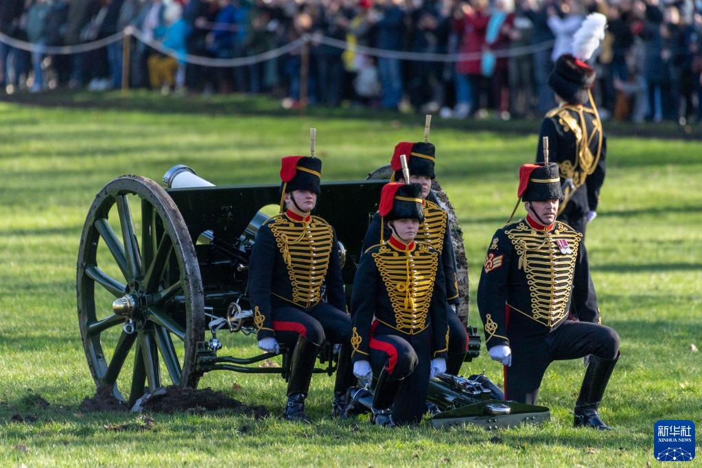 2月7日,英國士兵在倫敦白金漢宮旁的格林公園鳴放禮炮,慶祝女王伊麗莎白二世登基70周年。