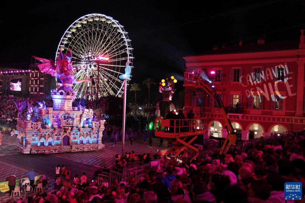 這是2月12日在法國南部城市尼斯拍攝的狂歡節花車夜間游行現場。
