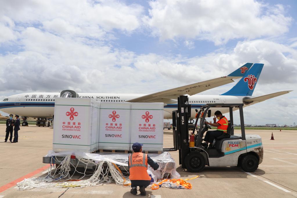 2021年10月14日,工作人員在柬埔寨金邊國際機場運輸中國政府援助柬埔寨的科興新冠疫苗。(新華社記者毛鵬飛攝)