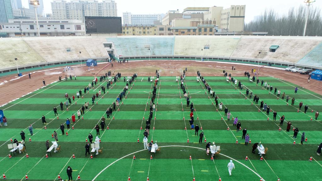 2月17日,在呼和浩特市人民體育場臨時核酸檢測點,周邊居民進行核酸檢測(無人機拍攝)。(新華社記者彭源攝)