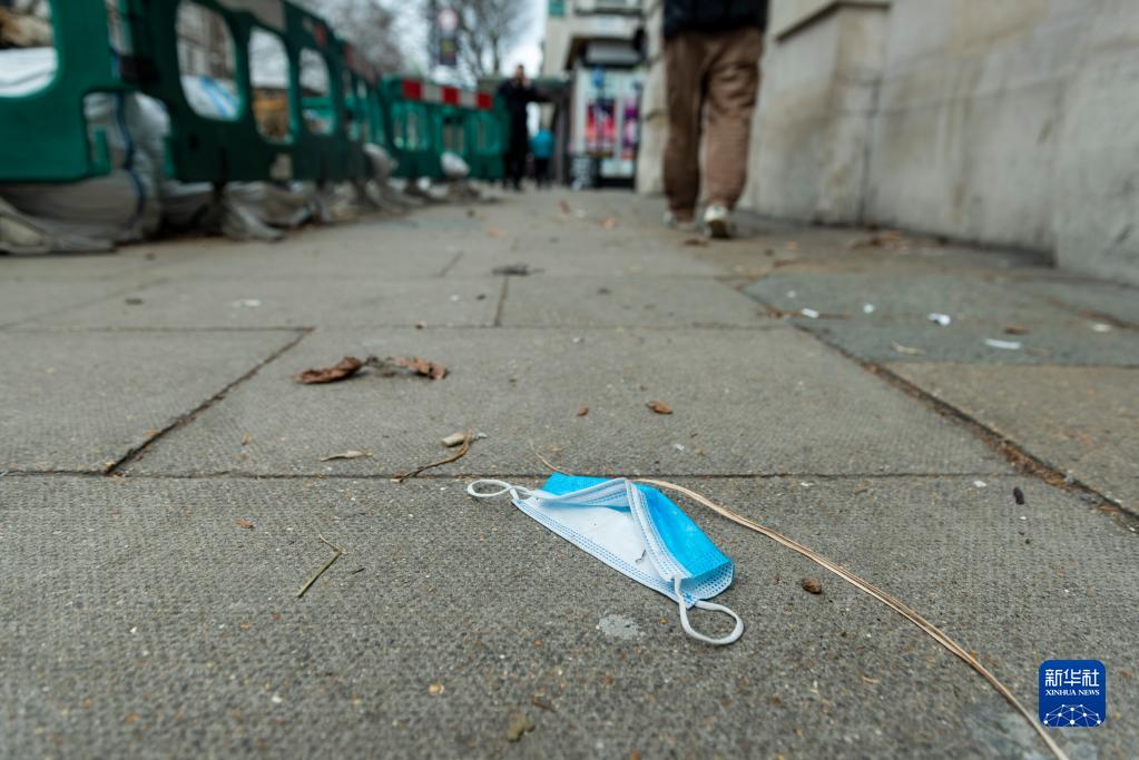 2月21日,在英國倫敦,一個口罩被丟棄在街上。
