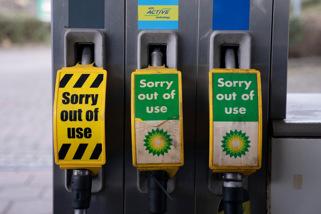 2022年3月17日,在英國曼徹斯特一處加油站,加油機上掛著“停止使用”的標識。新華社發(喬恩·休珀攝)