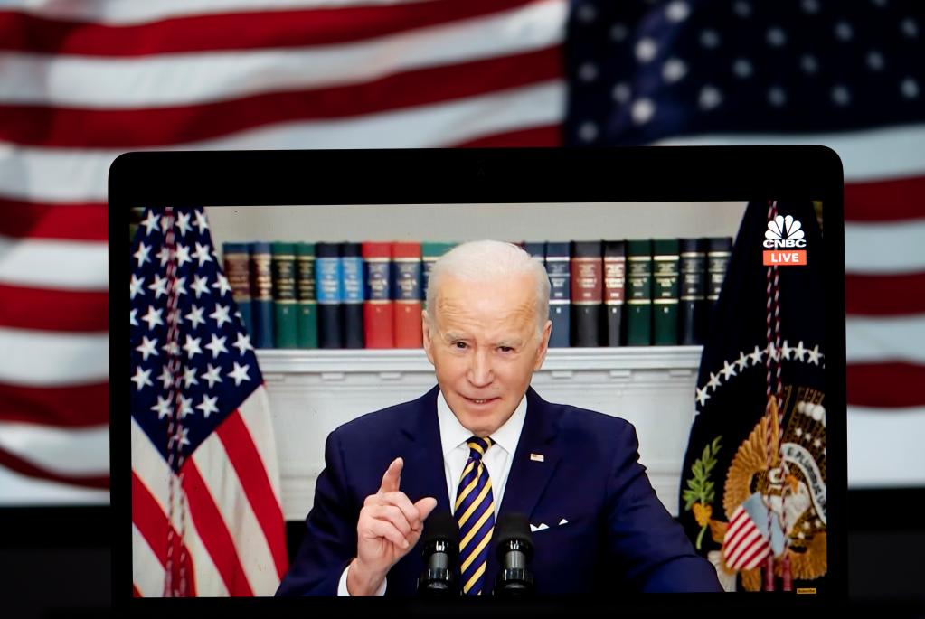 3月8日拍攝的視頻畫面顯示,美國總統拜登在華盛頓白宮發表講話。拜登8日宣布,美國將對俄實施能源禁運,停止從俄進口石油、天然氣和煤炭。(新華社記者劉杰攝)