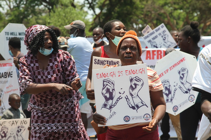2021年10月25日,人們在津巴布韋首都哈拉雷的美國駐津使館附近舉行游行示威,抗議西方國家對津制裁。新華社發(塔法拉·穆瓜拉攝)