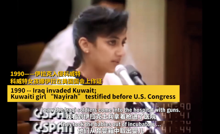 1990年10月10日,15歲少女娜伊拉在美國國會(huì)聲淚俱下地說出這段話。她自稱是科威特一家醫(yī)院的志愿者,目睹了伊拉克入侵科威特后這“慘絕人寰”的一幕。