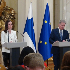 5月15日,在芬蘭赫爾辛基,芬蘭總統尼尼斯托(右)和總理馬林參加聯合記者會。新華社記者陳靜攝