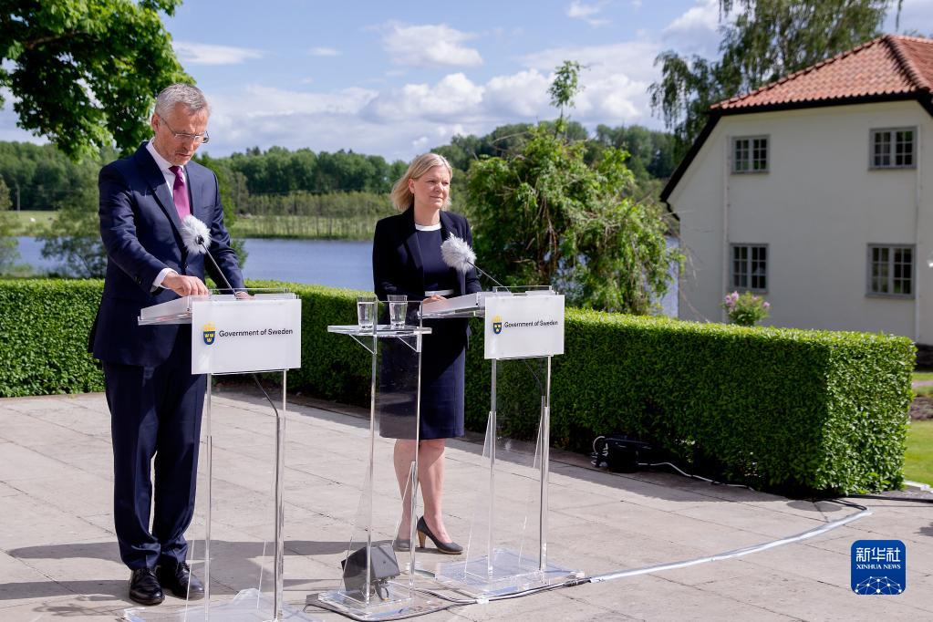 6月13日,瑞典首相安德松(右)與到訪的北約秘書(shū)長(zhǎng)斯托爾滕貝格在瑞典首都斯德哥爾摩以西約120公里的哈普松德首相夏季莊園出席新聞發(fā)布會(huì)。