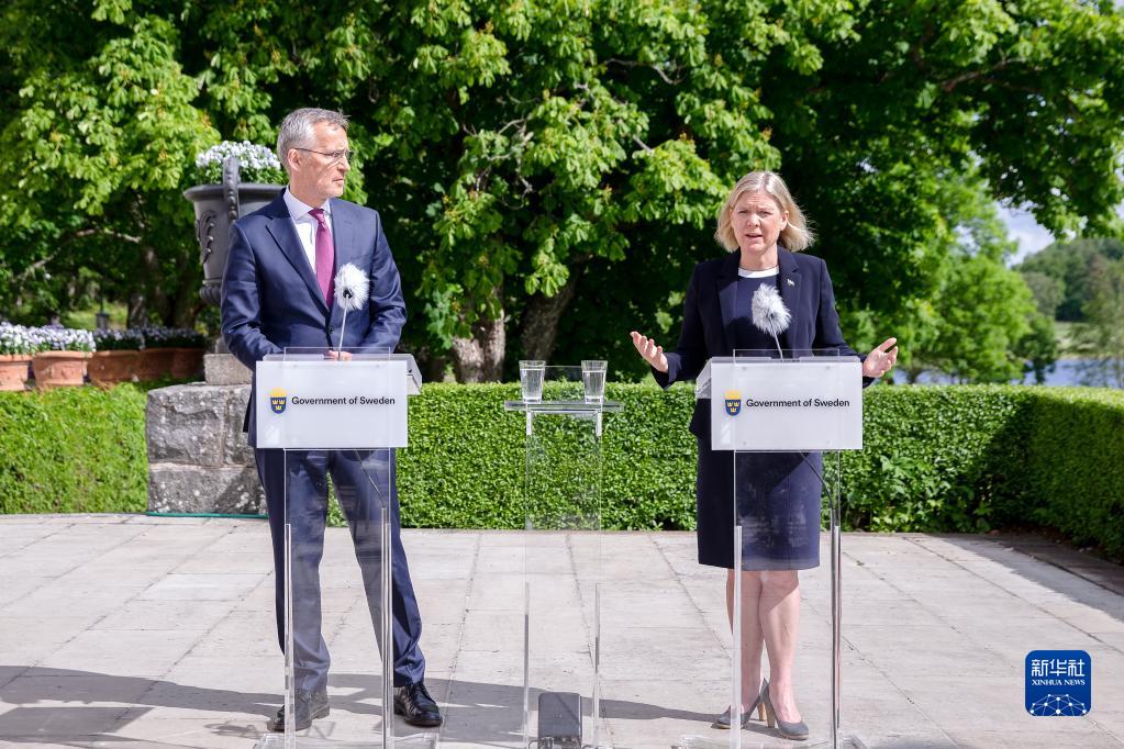 6月13日,瑞典首相安德松(右)與到訪的北約秘書長斯托爾滕貝格在瑞典首都斯德哥爾摩以西約120公里的哈普松德首相夏季莊園出席新聞發布會。