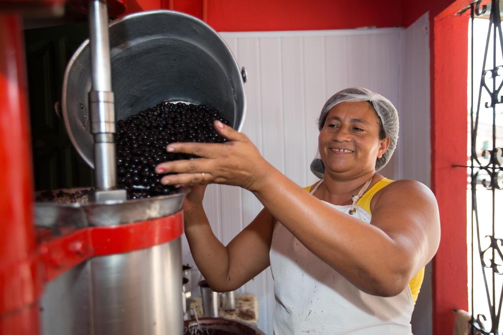 2017年7月15日,在巴西北部帕拉州維基亞市的“阿薩伊之家”小店,工作人員格洛麗亞將阿薩伊果倒入機器內打磨成果漿。新華社發(fā)(李明攝)