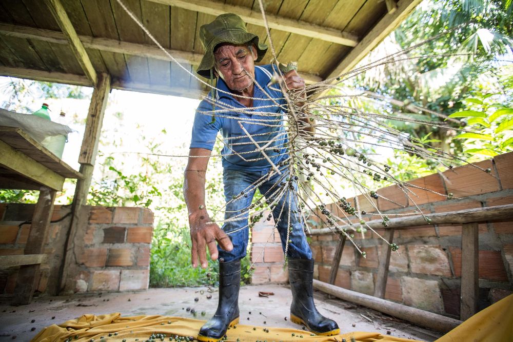 2017年7月15日,在巴西北部帕拉州維基亞市附近的圣若昂莊園,莊園主若昂·達席爾瓦將采摘的阿薩伊果從枝條上剝下。新華社發(fā)(李明攝)