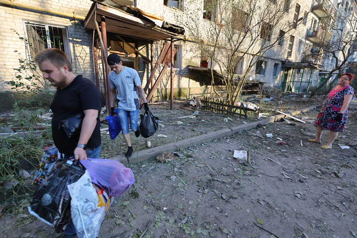 6月20日,頓涅茨克當地居民從被損壞的建筑撤離。新華社發(維克托攝)