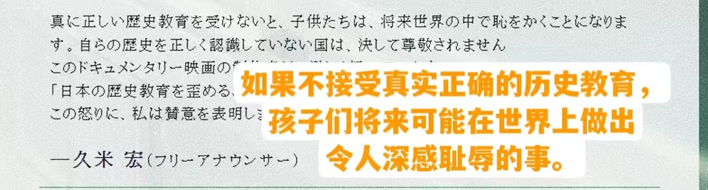 這部紀(jì)錄片由跟蹤報(bào)道日本教育多年的資深記者齊加尚代執(zhí)導(dǎo),聚焦日本政界如何通過(guò)篡改教科書歪曲歷史,又如何施壓學(xué)校和教師。片中多個(gè)真實(shí)事例令人深感震驚和憤怒。