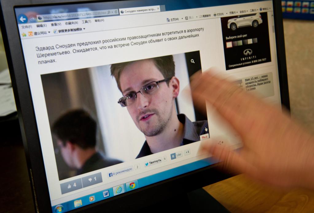 2013年7月12日,新聞工作者在俄羅斯首都莫斯科打開網頁瀏覽斯諾登的訊息。(新華社記者姜克紅攝)