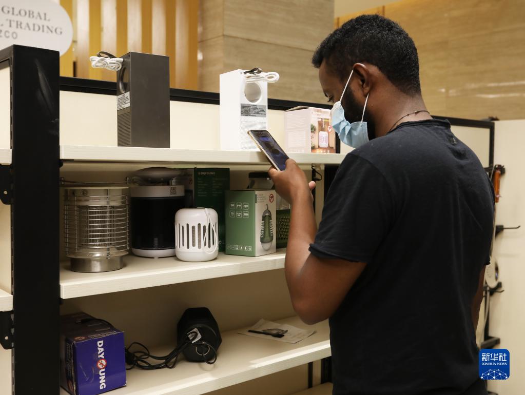 9月14日,在吉布提國際自貿區,一名非洲創業青年用手機查看跨境電商平臺商品。