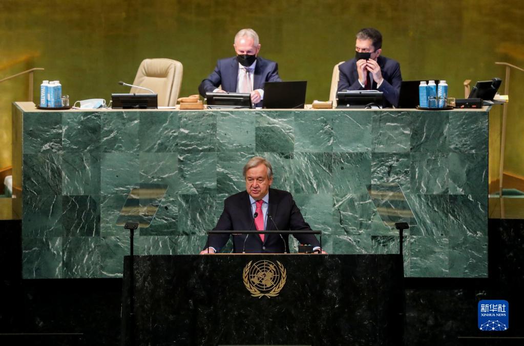 9月20日,在位于紐約的聯(lián)合國總部,聯(lián)合國秘書長古特雷斯(下)在聯(lián)合國大會一般性辯論開幕式上講話。