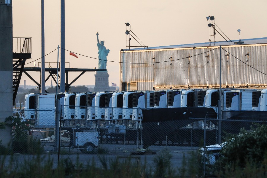 這是2021年9月6日在美國紐約布魯克林拍攝的一處臨時停尸場內存放新冠患者遺體的冷藏車。新華社記者 王迎 攝