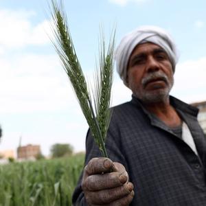 3月14日,農民在埃及蓋勒尤卜省的農田中展示麥穗。新華社發(艾哈邁德·戈馬攝)