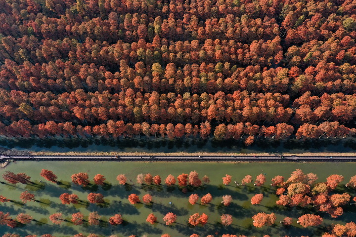 武漢漲渡湖濕地公園“水上森林”色彩斑斕。新華社發(趙軍攝)