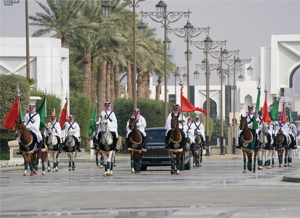 沙特王宮摩托車隊(duì)和馬隊(duì)護(hù)衛(wèi)習(xí)近平專車抵達(dá),沙特王儲(chǔ)兼首相穆罕默德在下車處熱情迎接,習(xí)近平在穆罕默德王儲(chǔ)陪同下檢閱王宮儀仗隊(duì),沙特王宮衛(wèi)隊(duì)以傳統(tǒng)執(zhí)劍禮儀向習(xí)近平表示最隆重歡迎。