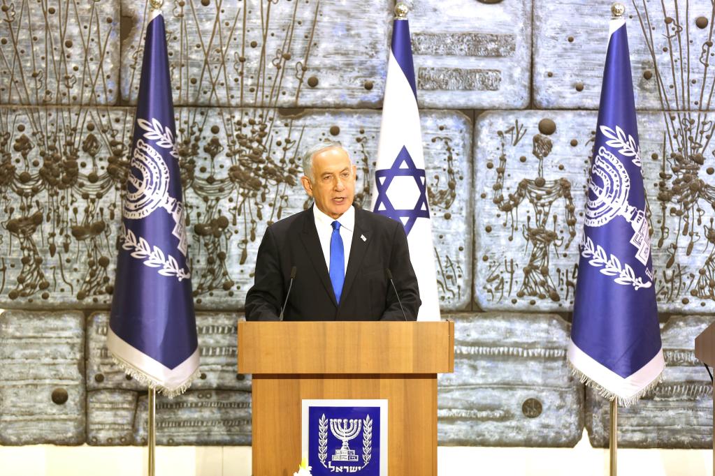 11月13日,內(nèi)塔尼亞胡在以色列總統(tǒng)府舉行的組建新政府授權(quán)儀式上發(fā)表講話。(新華社記者王卓倫攝)