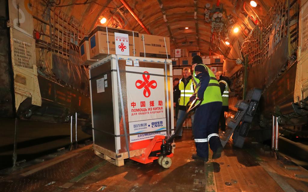 2022年11月12日,工作人員在白俄羅斯明斯克國際機場卸載中國政府援助的新一批新冠疫苗。新華社發(任科夫攝)