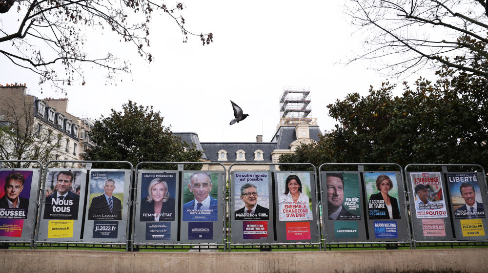 ↑2022年4月1日,在法國巴黎,一只鴿子飛過2022總統大選11名候選人(共12人)的競選海報。