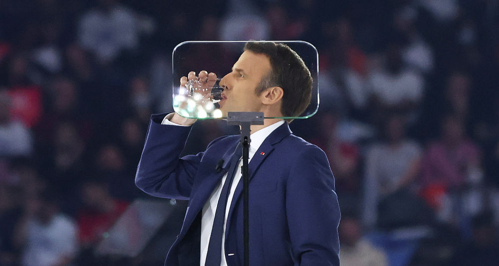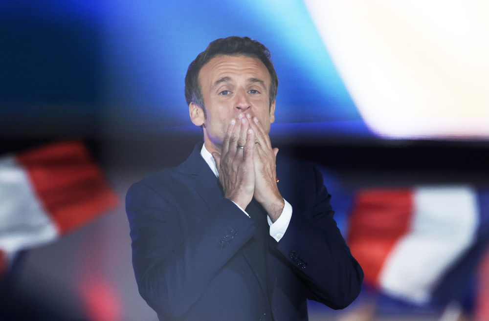 ↑2022年4月24日,法國現任總統馬克龍在巴黎出席選舉后的慶祝集會。