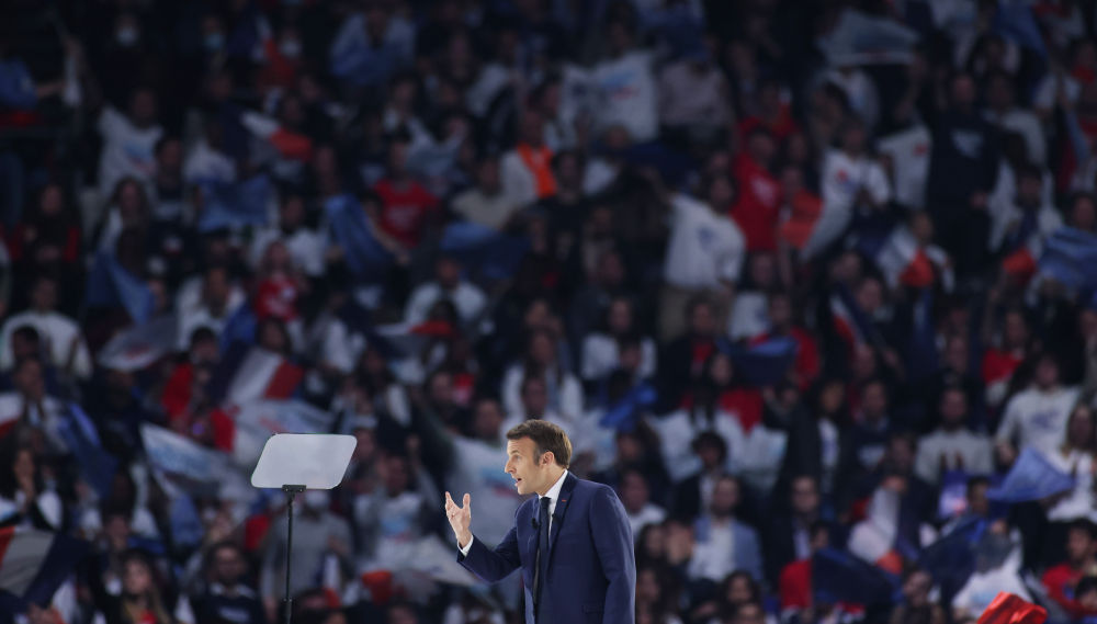 ↑2022年4月2日,法國總統馬克龍在巴黎附近的拉德芳斯體育館出席競選集會。
