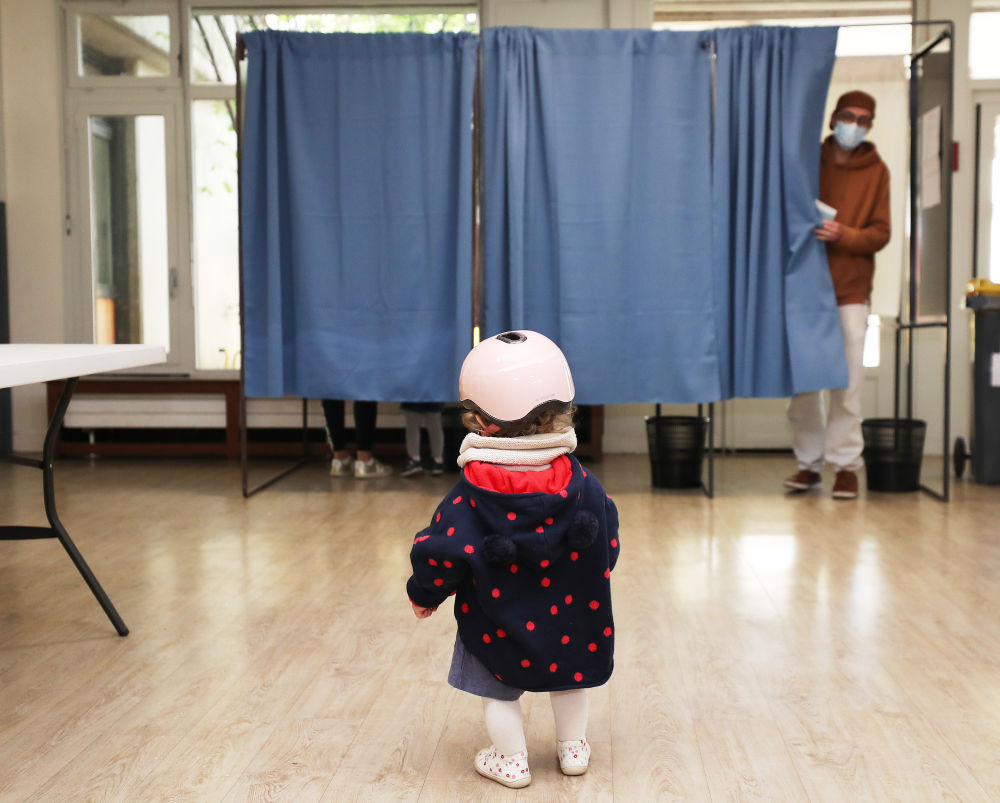 ↑2022年4月24日,在法國巴黎附近的克里希市一家投票站,一名女孩陪家長前來參加法國總統選舉第二輪投票。
