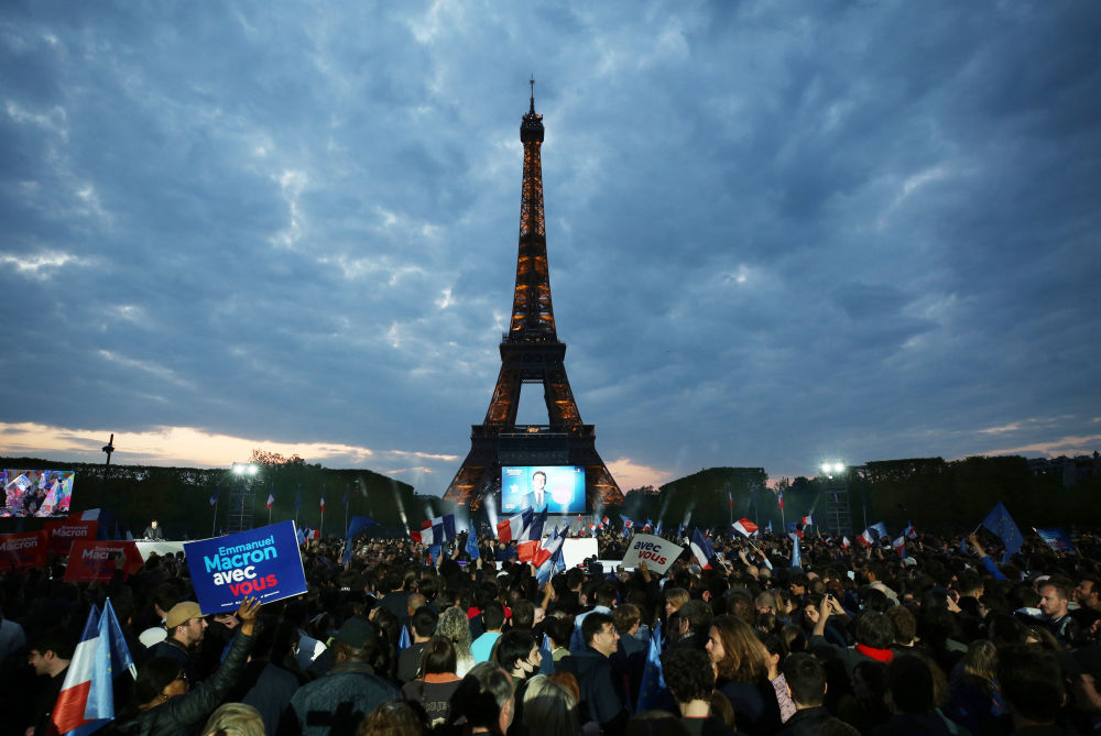 ↑2022年4月24日,人們在法國巴黎埃菲爾鐵塔下參加現任總統馬克龍的選后慶祝集會。