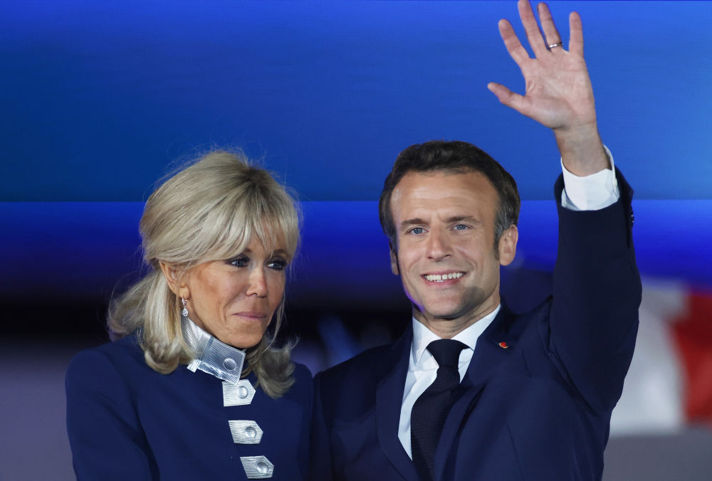 ↑2022年4月24日,法國現任總統馬克龍和夫人布麗吉特在巴黎出席選舉后的慶祝集會。
