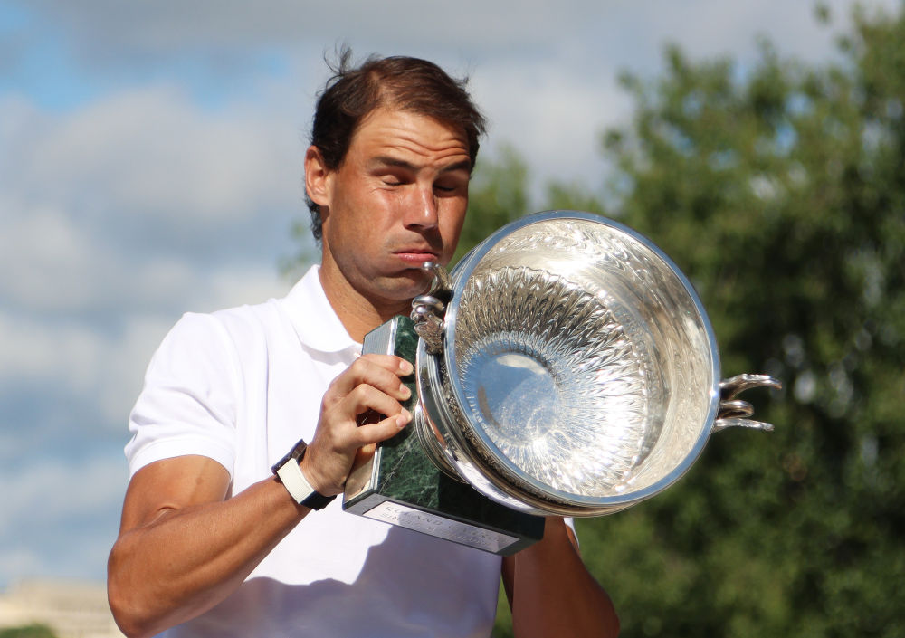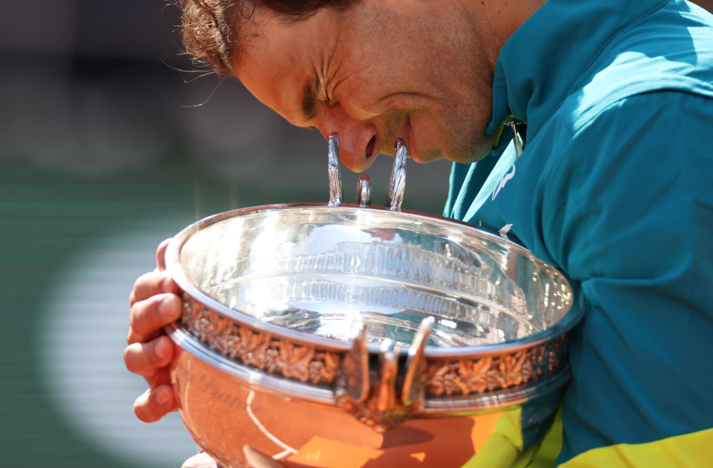 ↑2022年6月5日,2022法國網球公開賽男子單打冠軍西班牙選手納達爾在頒獎儀式上手捧冠軍獎杯。