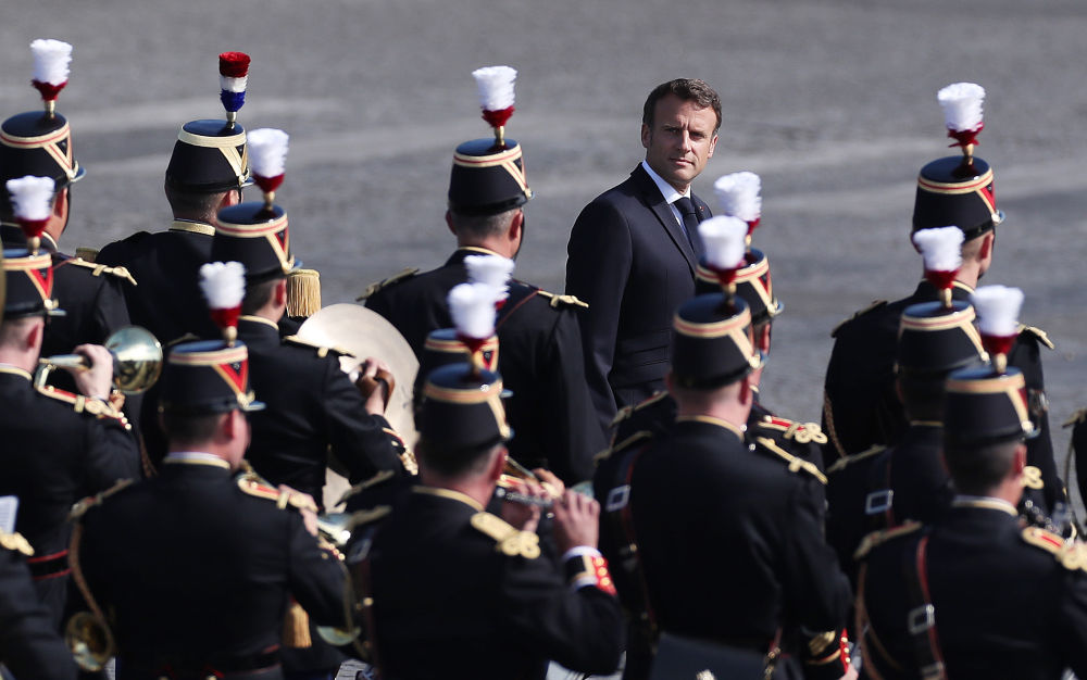 ↑2022年7月14日,法國總統馬克龍在巴黎協和廣場國慶閱兵式現場檢閱隊伍。