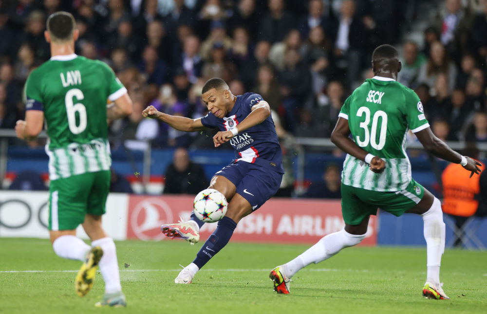 ↑2022年10月25日,巴黎圣日耳曼隊球員姆巴佩在2022-2023賽季歐洲足球冠軍聯賽小組賽H組第五輪比賽中射門。