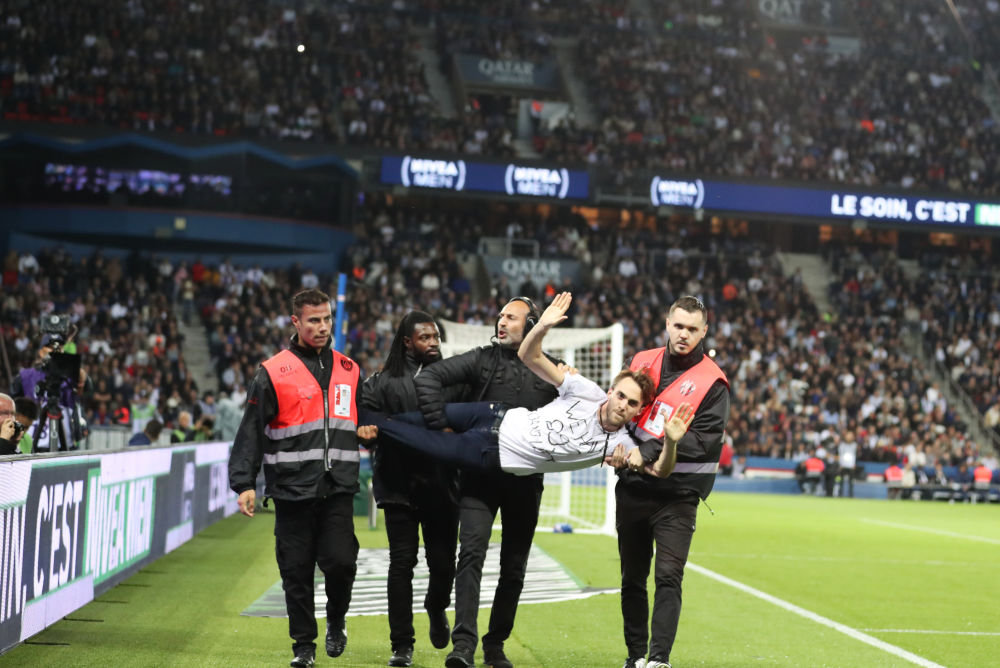 ↑2022年10月16日,在2022-2023賽季法國足球甲級聯賽第11輪比賽中,安保人員將闖入球場的示威者抬走。