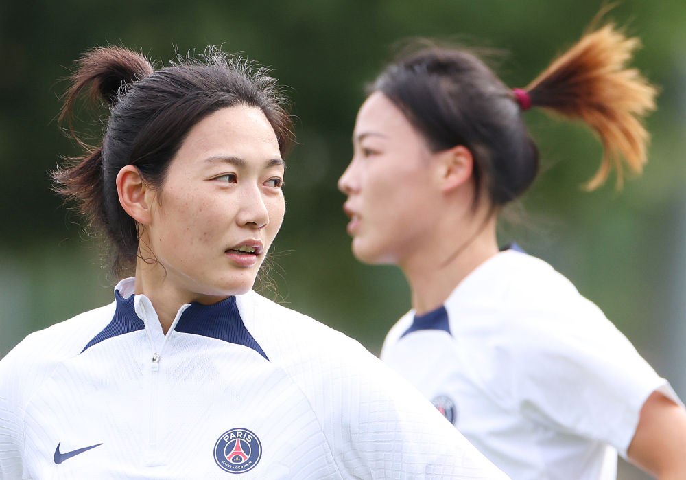 ↑2022年9月16日,租借加盟巴黎圣日耳曼女足的中國女足國腳楊莉娜(左)、李夢雯在位于巴黎近郊布日瓦勒的訓練基地參加賽前訓練。